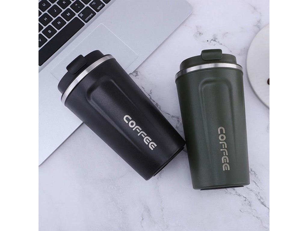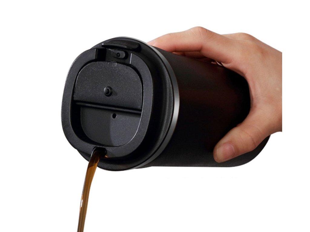 Termální hrnek vyrobený z nerezové oceli a pevného plastu. Velmi bezpečně se drží v ruce díky použití matného materiálu a ergonomickému designu. Má také víko ovládané pohodlným tlačítkem. Perfektní pro uchování studených a teplých nápojů díky dobrým tepelně izolačním vlastnostem.