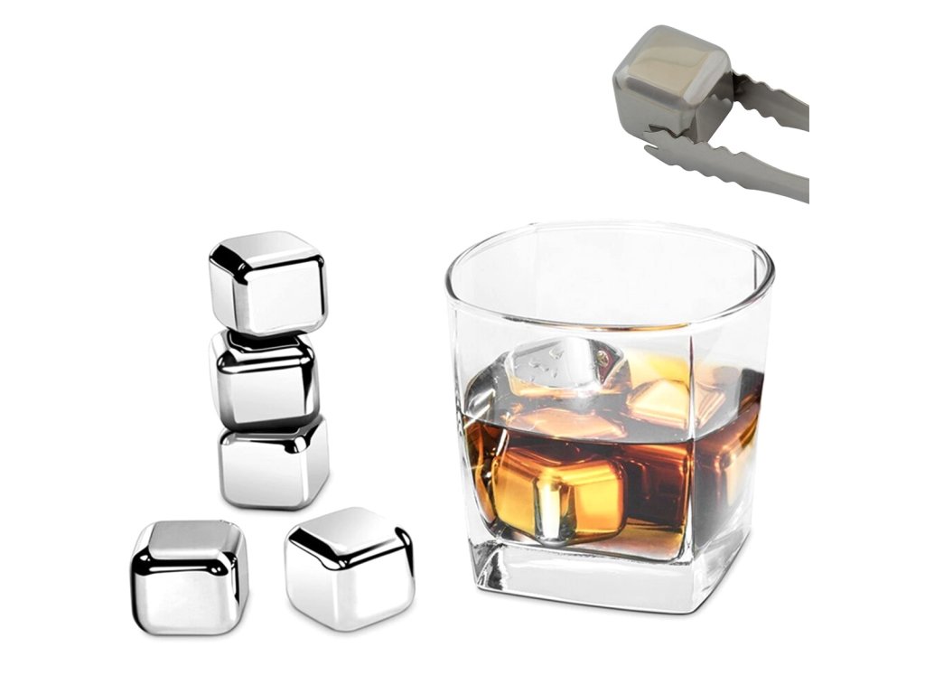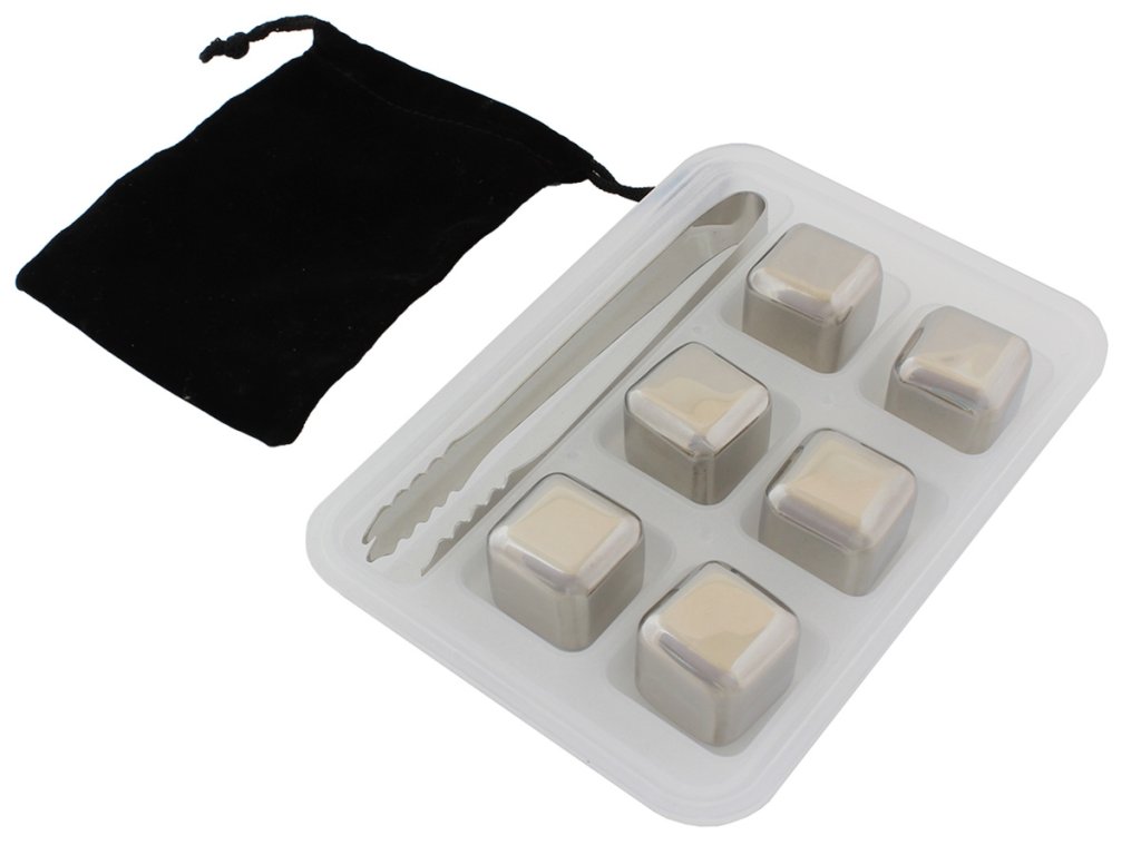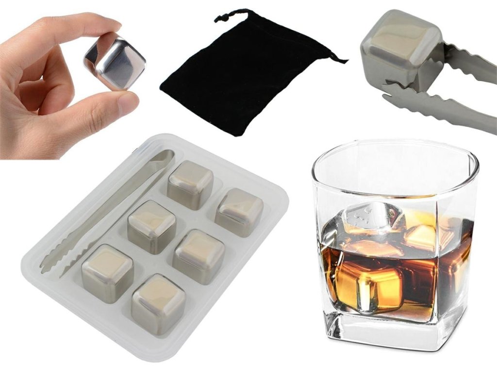 Kovové chladicí kostky na nápoje a whisky. Je to skvělá alternativa k tradičním kostkám ledu. Správně vychlazené dlouhodobě snižují teplotu našeho oblíbeného nápoje, aniž by jej ředily jako klasický, tající led. Mimořádně praktická sada 6 ocelových kostek je také skvělým tipem na dárek pro milovníky silnějších nápojů :) Kostky je vhodné dát na pár hodin do mrazáku a po vychladnutí vložit do sklenice s nápojem. Sada obsahuje přídavné pouzdro a kleště pro uchopení kostek s pohodlným překrytím.