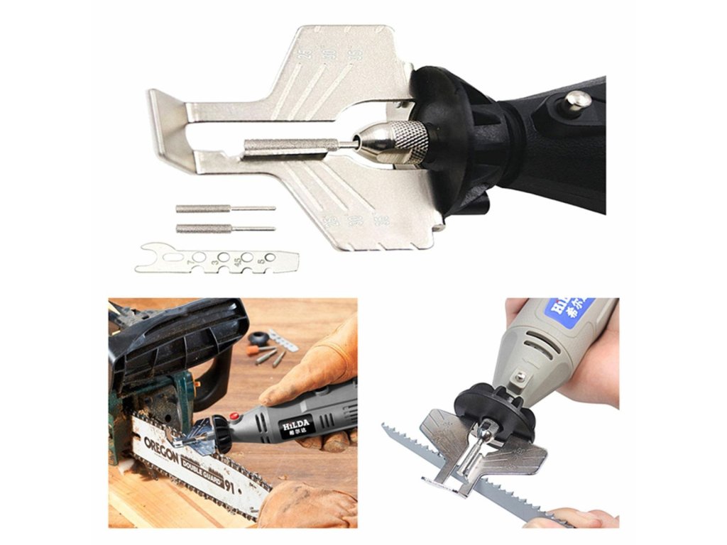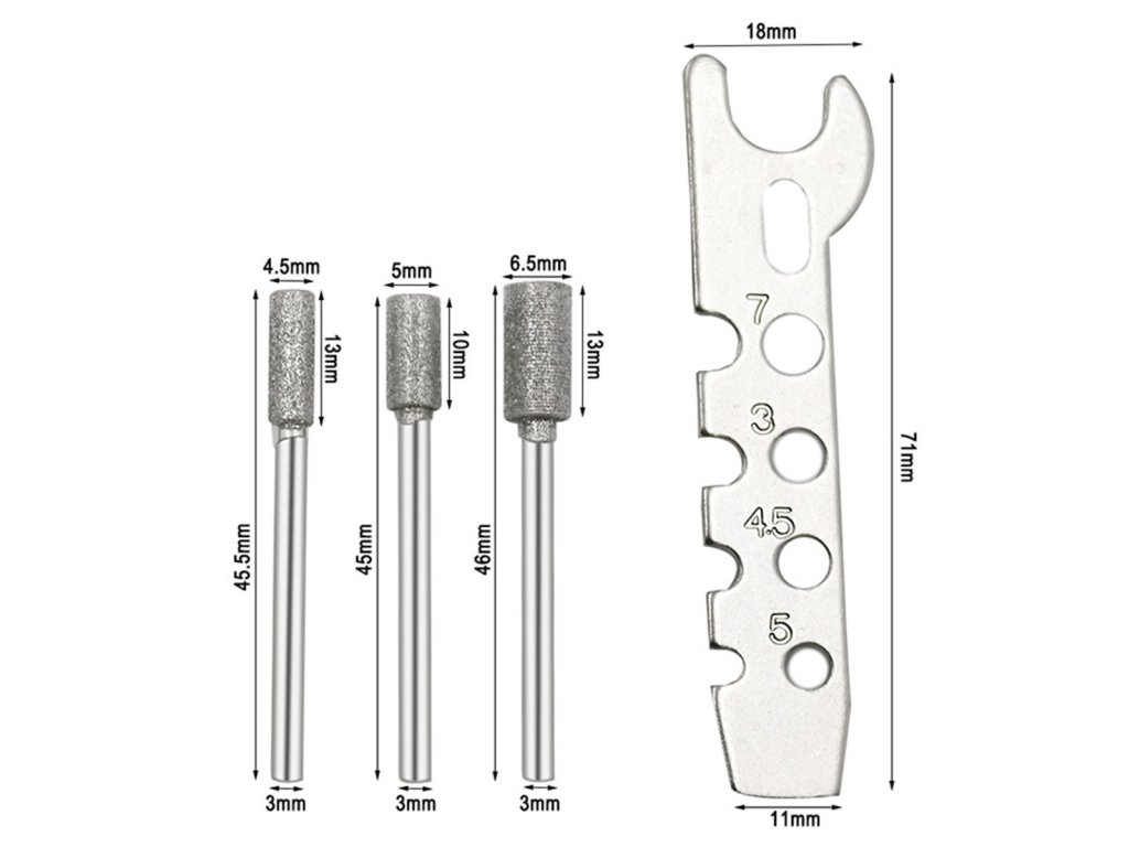 - Všestrannost s vyměnitelnými válečky: Balení obsahuje tři brusné válečky (průměry 4,5 mm, 5 mm a 6,5 mm), které vám umožní přizpůsobit ostření různým typům řetězů.