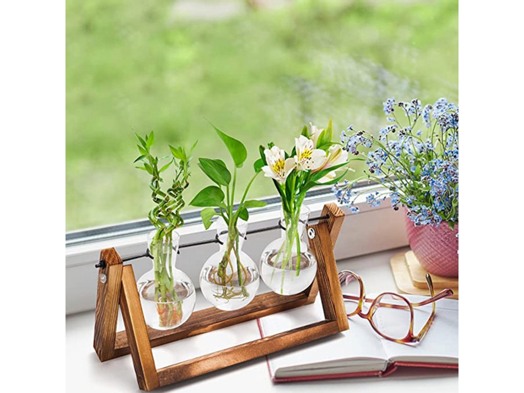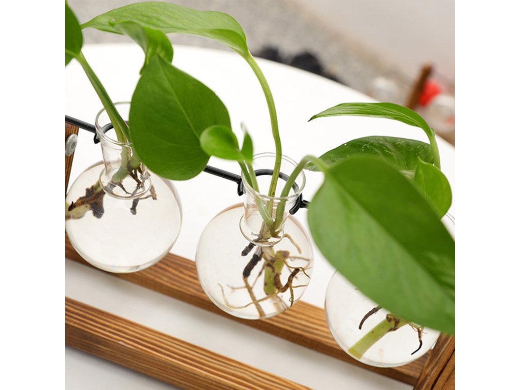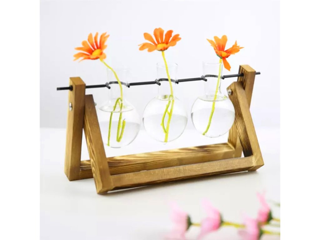 Hydroponická váza se třemi skleněnými nádobami. Je ideální pro domácí pěstování květin a bylinek. Hydroponická technika je kultivace bez půdy za použití vody a roztoků minerálních solí, které umožňují rostlinám růst bez použití půdy. Má estetický, dřevěný stojan. Perfektní jako vnitřní dekorace, zobrazující celý kořenový systém rostlin.