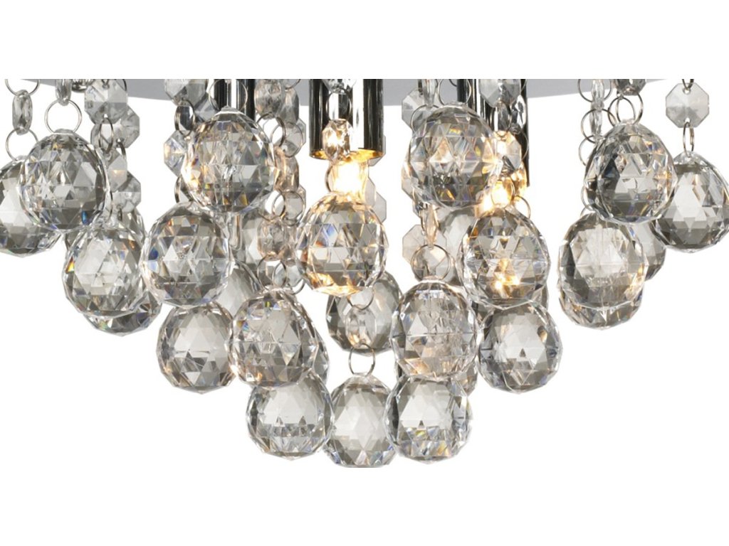 Skvělý dekorativní prvek - chromové stropní svítidlo s krystaly. Všechny tři světelné body (zásuvky G9) jsou umístěny mezi jemně opracovanými krystaly. Je to skvělý nápad, jak ozdobit klasicky hotové místnosti nebo rozzářit tmavé kouty! Skvěle se hodí do bohatě zdobených interiérů.