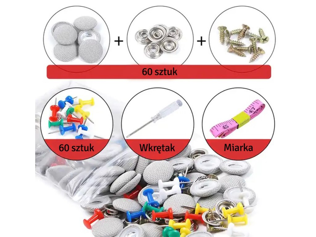 Sada na opravu obložení stropu auta. Umožňuje rychle připevnit padající obložení stropu pomocí speciálních opravných nýtů a čepů. Sada také obsahuje šroubovák a centimetr pro ještě jednodušší práci.