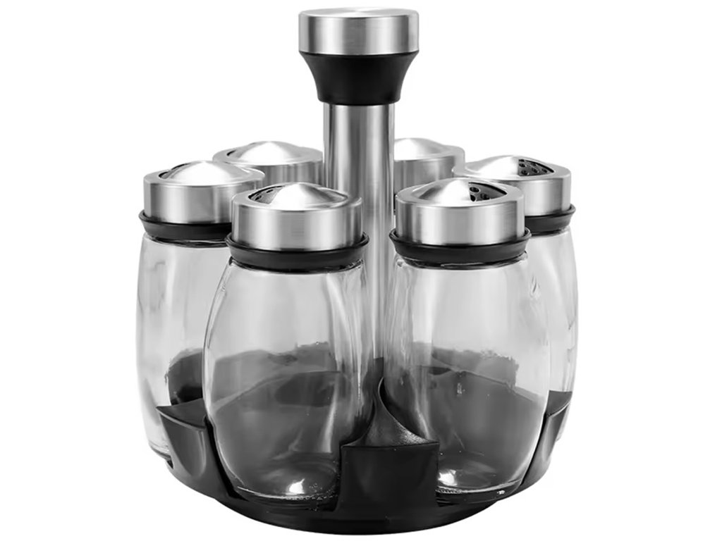 Sada 6 průhledných nádob na koření s vyhrazenou otočnou základnou. Jedná se o základní prvek vybavení vaší kuchyně. Bezbarvé sklo usnadňuje rozpoznání správného koření. Všechny nádoby mají úzce rozmístěné otvory pro větší přesnost dávkování. Sada je vyrobena ze skla a nerezové oceli, což zajišťuje dlouhé a bezproblémové používání a bude dokonale ladit s dekorem každé kuchyně.