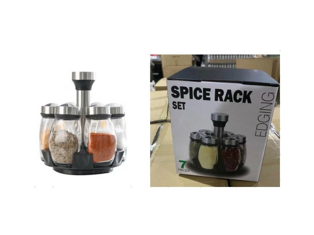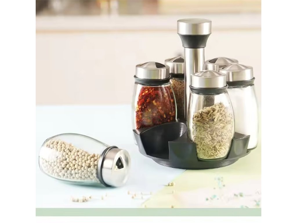 - Sada 6 průhledných nádob na koření s vyhrazenou otočnou základnou.