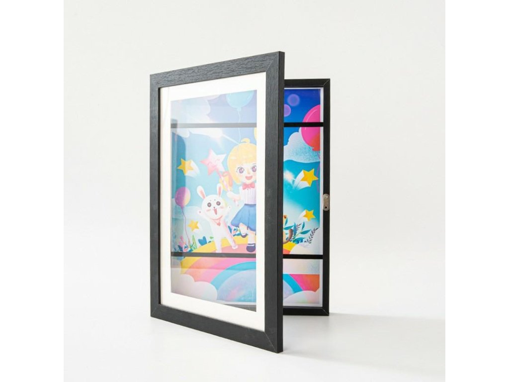 Dřevěný rám na fotografie / obrázky ve formátu A4. Umožňuje vám pohodlně uložit až několik desítek listů A4 ve vestavěné přihrádce. Fotografie, které nejsou vystaveny, jsou zajištěny elastickými pásky uvnitř rámu. Rám má praktické magnetické zavírání na vnější straně rámu.