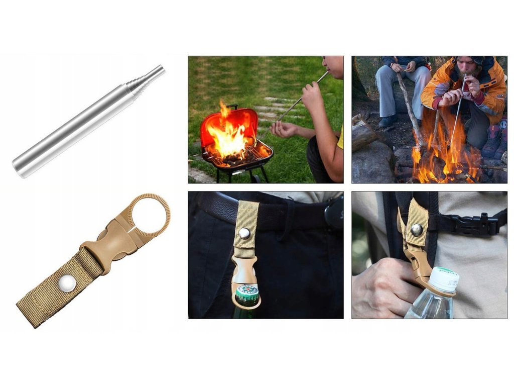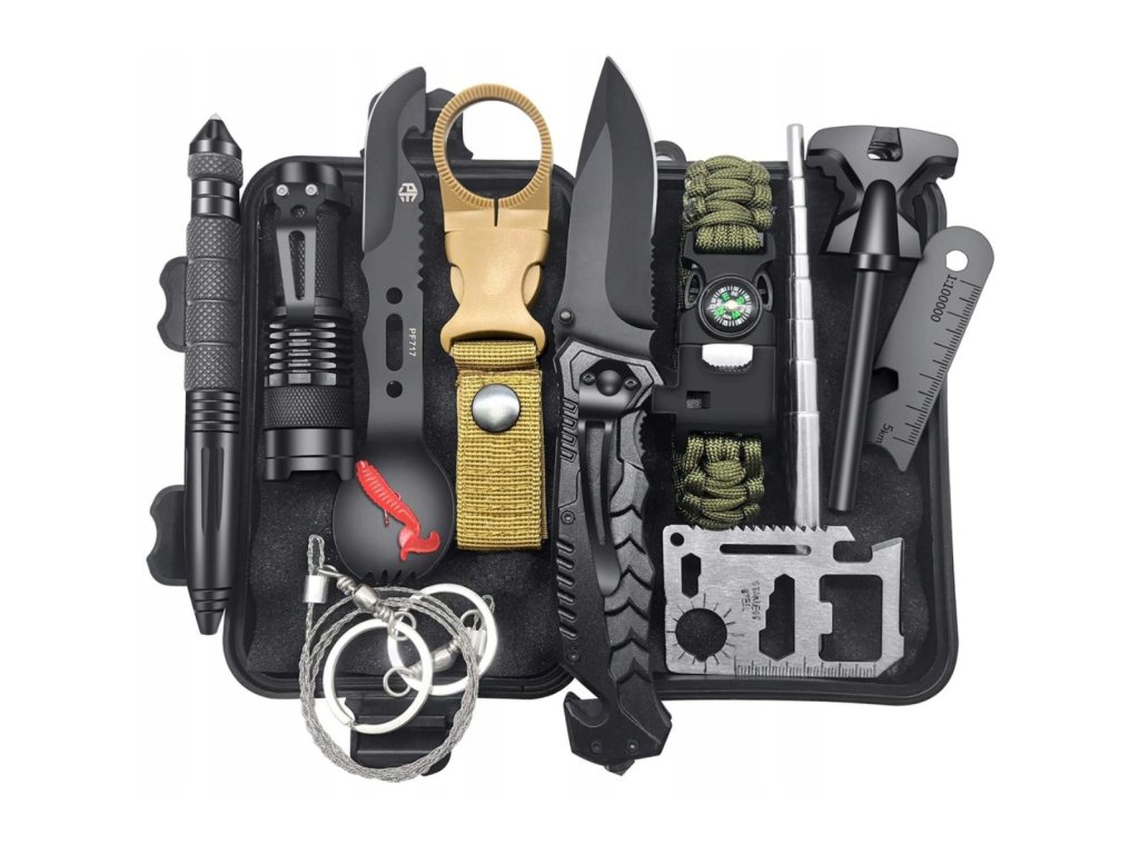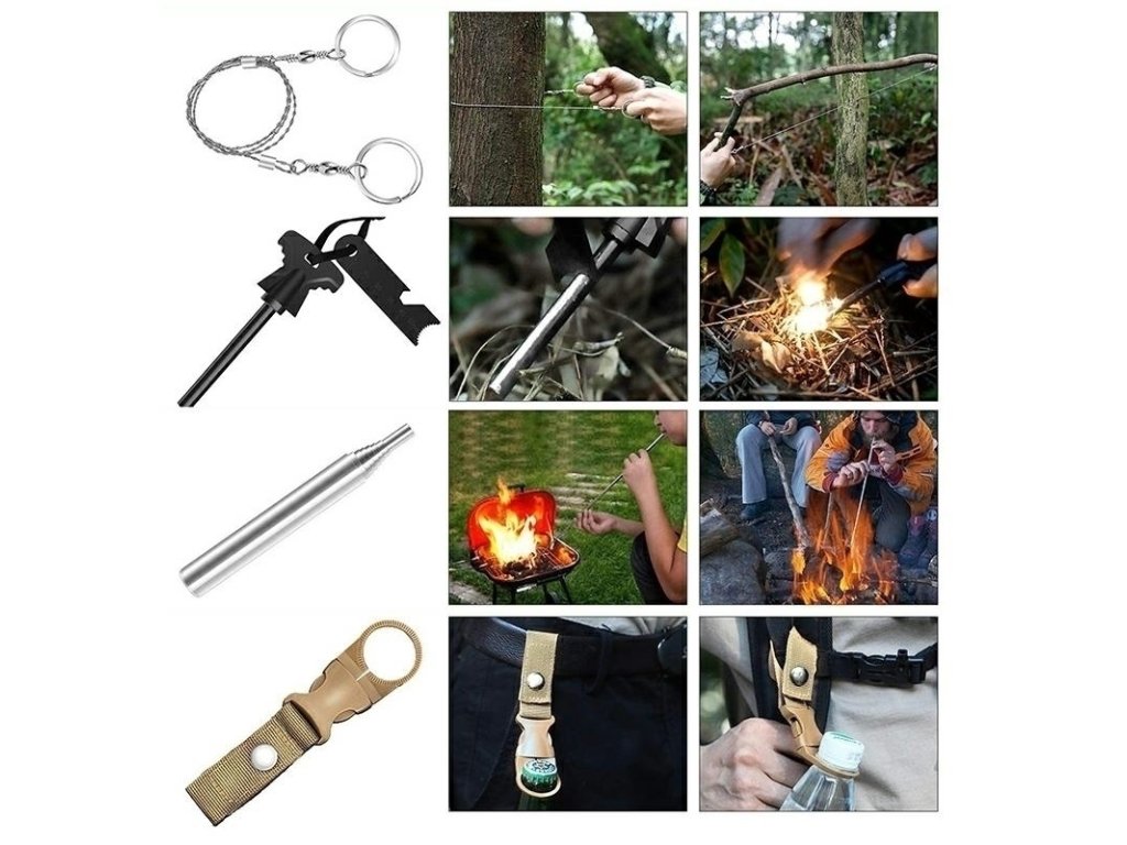 Sada pro nouzové přežití se základními nástroji.