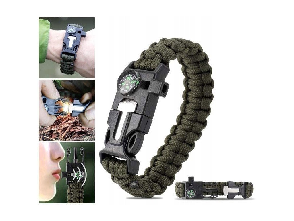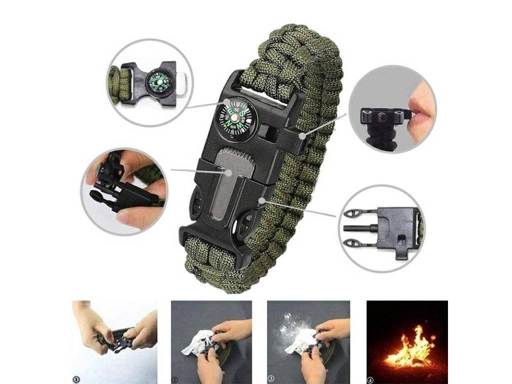- Náramek pro přežití s ??kompasem, hořčíkovým kamínkem a signální píšťalkou (řemínek / náramek z odolného lana, délka cca 3 m)
