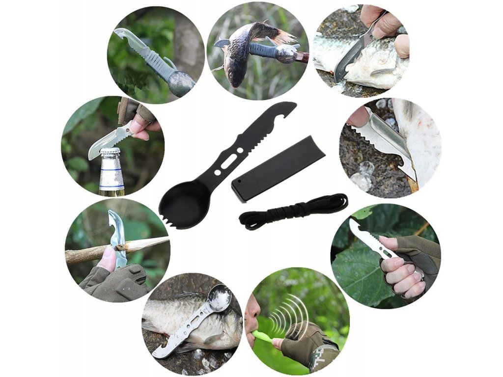 - Lžíce-vidlička s nožem, pilkou a otvírákem na láhve (rukojeť funguje jako signální píšťalka)