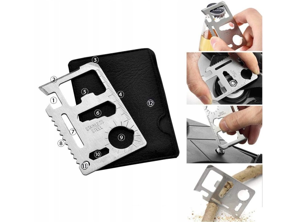 - Karta přežití 11 v 1 s pravítkem, pilou, úhloměrem, otvírákem, čepelí atd.