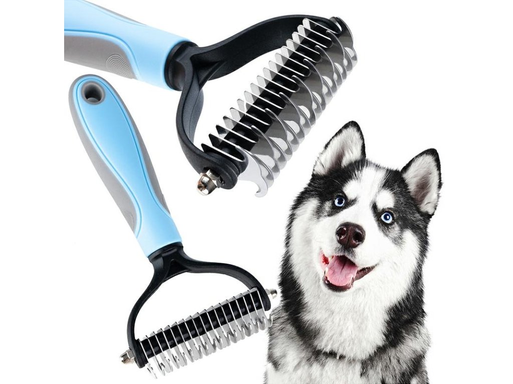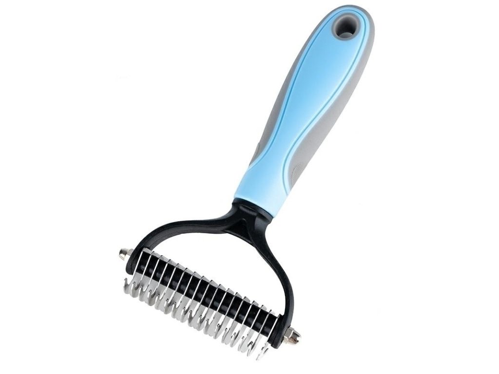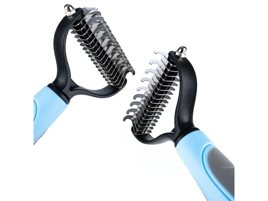 Zgrzebło - grzebień do wyczesywania kołtunów, splątanej sierści psów i kotów. Grzebień doskonale wyczesuje martwe włosy i sierść, posiada zaokrąglone zęby dzięki czemu jest bezpieczny dla zwierząt. Specyfikacja: dwustronne ostrza ze stali nierdzewnej z zaokrąglonymi końcami (17+9) zaostrzone są tylko wewnętrzne krawędzie, dzięki czemu skóra psa lub kota jest bezpieczna doskonale usuwa martwą i splątaną sierść oraz włosy wygodny uchwyt wymiary: 17x9cmDoplňkové parametry
