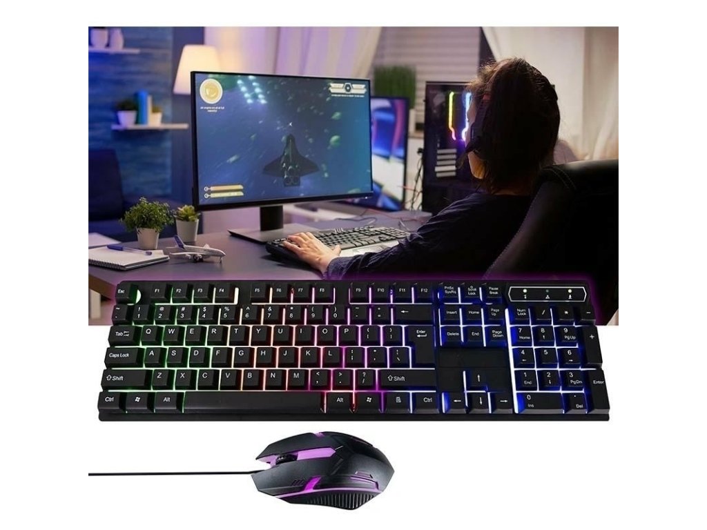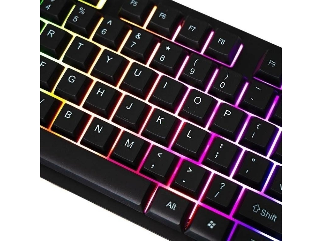 Podsvícená ergonomická klávesnice s myší pro hráče. Vícebarevné LED podsvícení. Navíc systém pro vypouštění vody v případě náhodného zaplavení kláves.Klávesnice: - Připojení: kabelové USB (2.0, 3.0) - Délka kabelu: 1,3 m - Rozměry: 440x135x30 mm - Vodotěsné Myš: - Senzor: optický - Připojení: kabelové USB (2.0 nebo 3.0) - Rozlišení 120 Dpi
