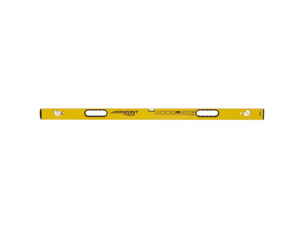 Horizont EXACTA 3 libely, PŘESNOST 0,3MM/M = 0,017° (V ZÁKLADNÍ POLOZE), zesílený ALU profil 2,2mm, frézovaná základna, kapalina v libelách UV stabilizovaná a fluorescenční, otická horizontální libela - snadné a přesnější měření, dvojité kroužky v libele umožňují nastavit sklon 2%, vodováha je odolná proti provozním nárazům, KAŽDÝ KUS ELEKTRONICKY TESTOVÁN.Doplňkové parametry