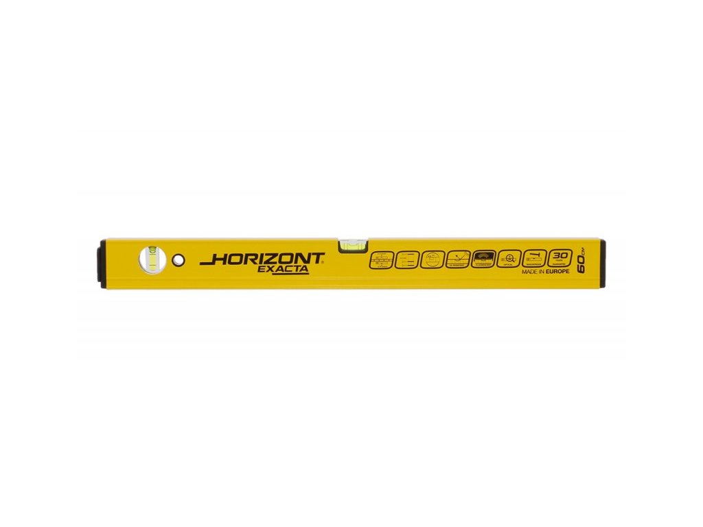 Horizont EXACTA 2 libely, PŘESNOST 0,3MM/M = 0,017° (V ZÁKLADNÍ POLOZE), zesílený ALU profil 2,2mm, frézovaná základna, kapalina v libelách UV stabilizovaná a fluorescenční, otická horizontální libela - snadné a přesnější měření, dvojité kroužky v libele umožňují nastavit sklon 2%, vodováha je odolná proti provozním nárazům, KAŽDÝ KUS ELEKTRONICKY TESTOVÁN.Doplňkové parametry
