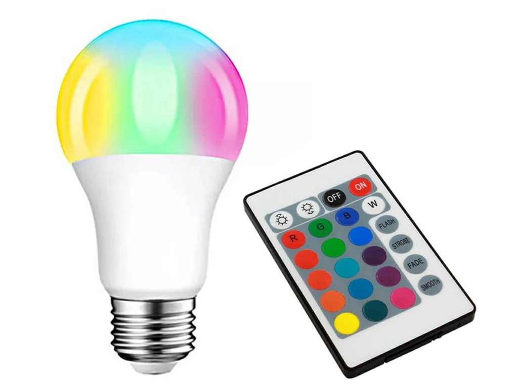 - LED RGB E27 žárovka s 16 barvami na výběr (podle barev na přiloženém dálkovém ovladači)