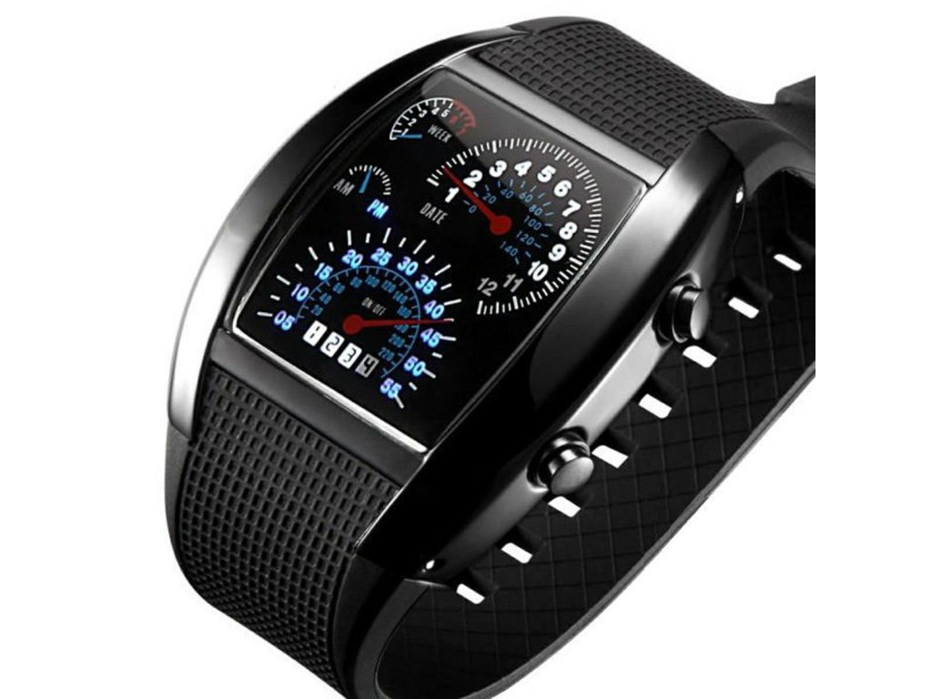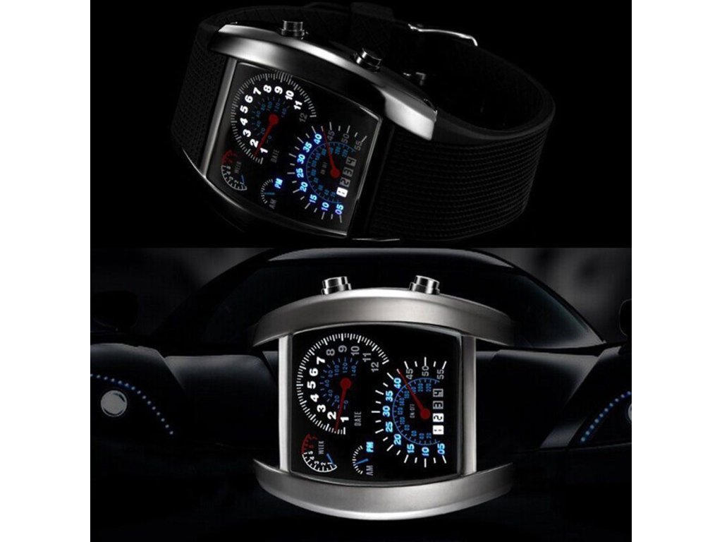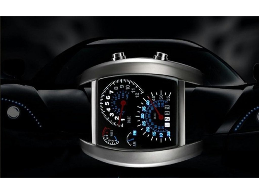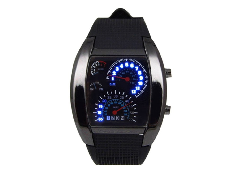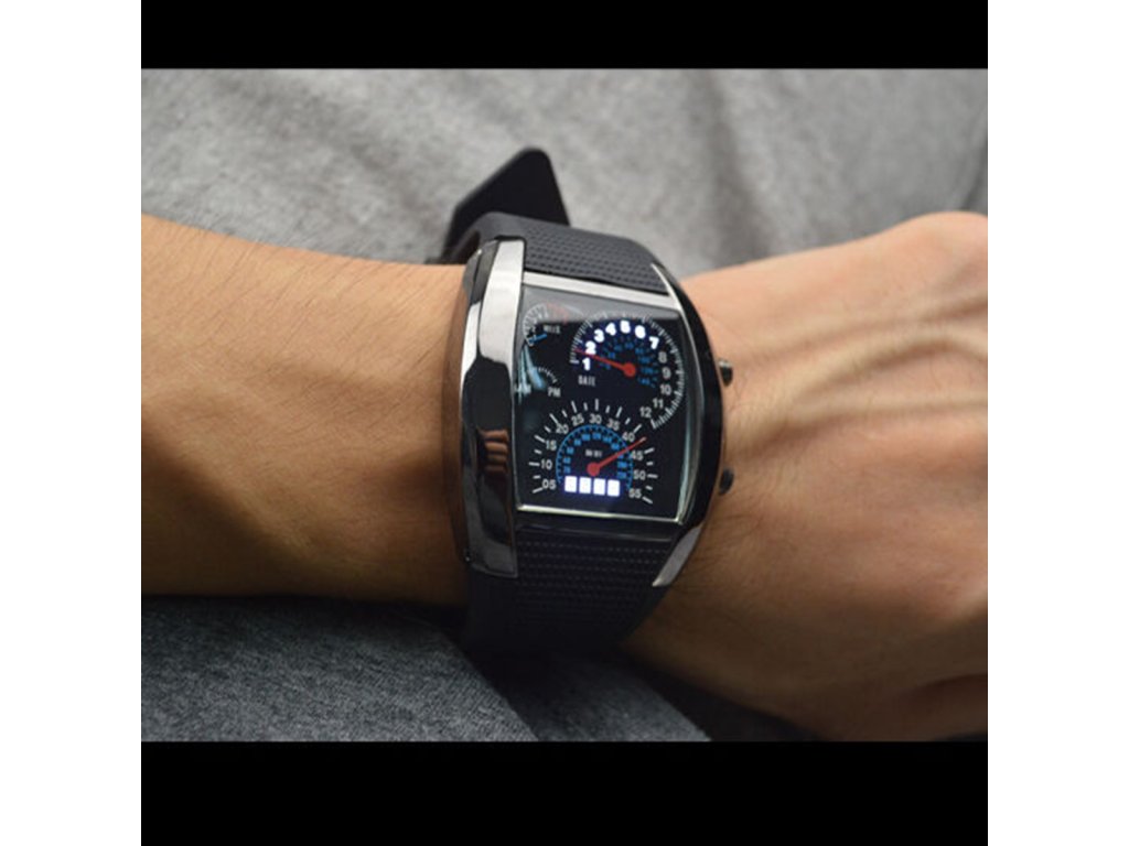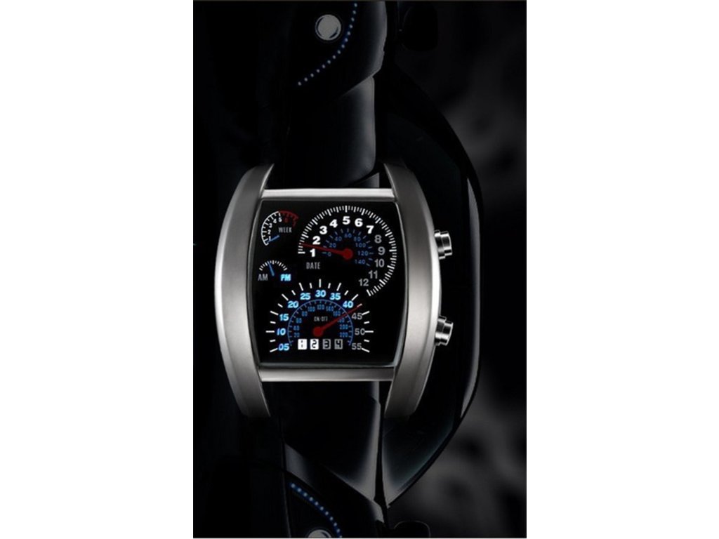 Absolutní HIT! Binární hodinky zaujmou ostatní a udělají na ně úžasný dojem! Zobrazuje datum a čas pomocí imitace automobilových hodin. Modré podsvícení dokonale kontrastuje s černým ciferníkem. Díky použití energeticky úsporné LED technologie hodinky nevyžadují časté výměny baterie. Skvělý dárek pro každého milovníka dvou a čtyř kol!